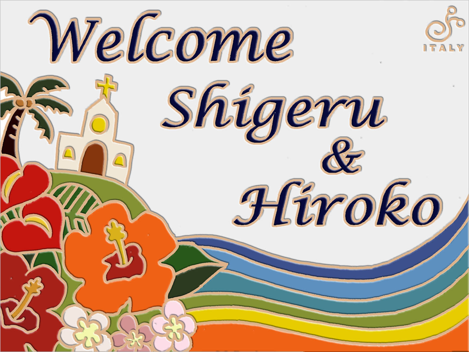 ハワイ好きの方、南国やマリンスポーツがお好きな方にぴったりの、カラフルな釉薬(絵の具)の特徴をめいっぱい生かしたデザインのウェルカムボードです。